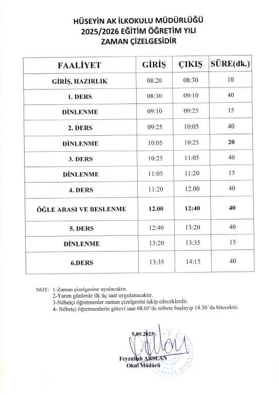 HÜSEYİN AK İLKOKULU 2025 2026 EĞİTİM ÖĞRETİM YILI ZAMAN ÇİZELGESİ